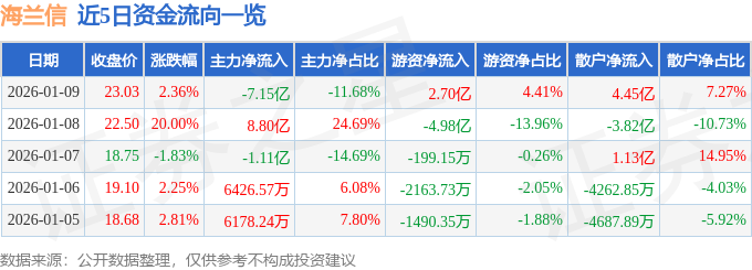证券之星消息,截至2026年1月9日收盘,海兰信(300065)报收于23.03元,上涨2.36%,换手率39.5%,成交量259.44万手,成交额61.22亿元。