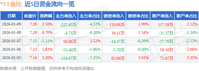 证券之星消息,截至2026年1月9日收盘,*ST金比(002762)报收于7.38元,上涨2.5%,换手率3.6%,成交量7.62万手,成交额5525.44万元。