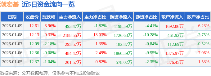 证券之星消息,截至2026年1月9日收盘,潮宏基(002345)报收于12.61元,上涨3.96%,换手率2.53%,成交量21.91万手,成交额2.72亿元。