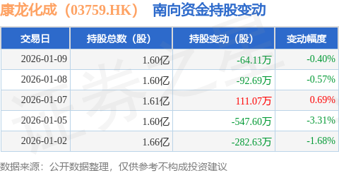 证券之星消息,1月9日南向资金减持64.11万股康龙化成(03759.HK)。近5个交易日中,获南向资金减持的有4天,累计净减持875.95万股。近20个交易日中,获南向资金减持的有11天,累计净减持778.63万股。截至目前,南向资金持有康龙化成(03759.HK)1.6亿股,占公司已发行普通股的52.96%。