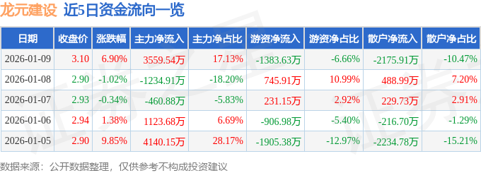 证券之星消息,截至2026年1月9日收盘,龙元建设(600491)报收于3.1元,上涨6.9%,换手率4.51%,成交量69.07万手,成交额2.08亿元。