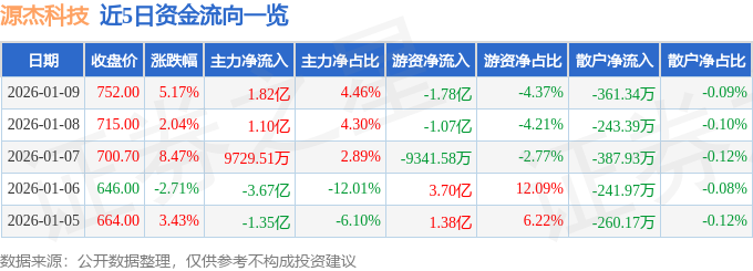 证券之星消息,截至2026年1月9日收盘,源杰科技(688498)报收于752.0元,上涨5.17%,换手率6.68%,成交量5.61万手,成交额40.84亿元。