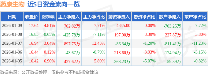 证券之星消息,截至2026年1月9日收盘,药康生物(688046)报收于17.64元,上涨4.81%,换手率1.29%,成交量5.28万手,成交额9111.32万元。