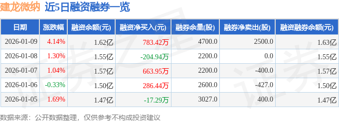 建龙微纳融资融券信息显示,融资方面,当日融资买入1776.75万元,融资偿还993.33万元,融资净买入783.42万元。融券方面,融券卖出2900.0股,融券偿还400.0股,融券余量4700.0股,融券余额16.78万元。融资融券余额1.63亿元。