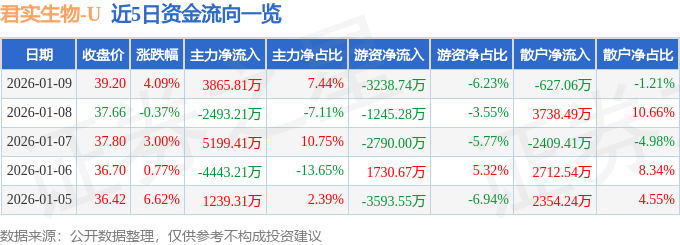 证券之星消息,截至2026年1月9日收盘,君实生物(688180)报收于39.2元,上涨4.09%,换手率1.77%,成交量13.56万手,成交额5.2亿元。