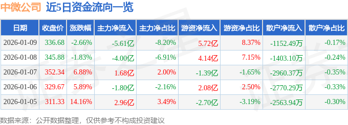 证券之星消息,截至2026年1月9日收盘,中微公司(688012)报收于336.68元,下跌2.66%,换手率3.25%,成交量20.38万手,成交额68.35亿元。