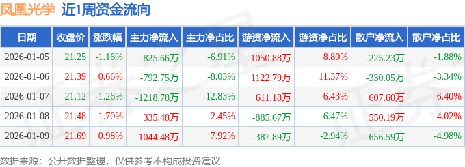 资金流向数据方面,本周凤凰光学主力资金合计净流出1457.23万元,游资资金合计净流入1511.3万元,散户资金合计净流出54.07万元。本周资金流向一览见下表: