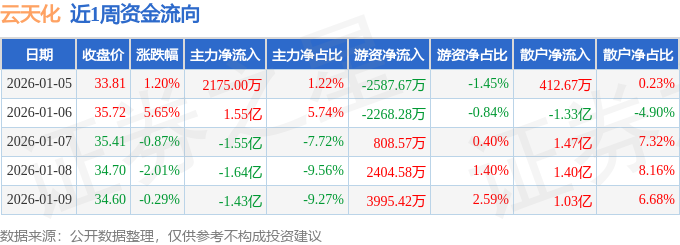 资金流向数据方面,本周云天化主力资金合计净流出2.85亿元,游资资金合计净流入2352.62万元,散户资金合计净流入2.62亿元。本周资金流向一览见下表: