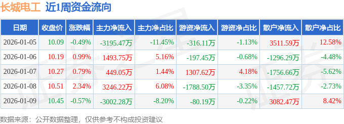 资金流向数据方面,本周长城电工主力资金合计净流出1008.74万元,游资资金合计净流出1074.64万元,散户资金合计净流入2083.38万元。本周资金流向一览见下表: