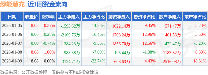 资金流向数据方面,本周绿能慧充主力资金合计净流出9260.7万元,游资资金合计净流入5000.27万元,散户资金合计净流入4260.44万元。本周资金流向一览见下表: