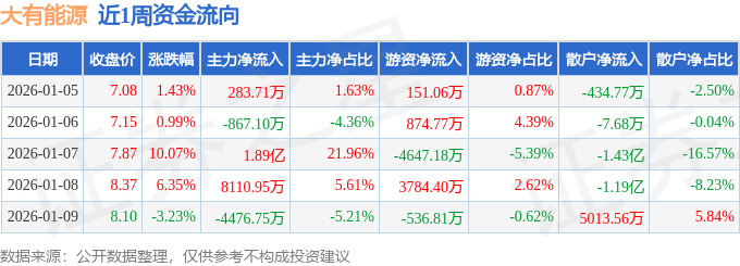 证券之星消息,截至2026年1月9日收盘,大有能源(600403)报收于8.1元,较上周的6.98元上涨16.05%。本周,大有能源1月8日盘中最高价报8.54元。1月5日盘中最低价报6.96元。本周共计1次涨停收盘,无跌停收盘情况。大有能源当前最新总市值193.66亿元,在煤炭开采板块市值排名17/30,在两市A股市值排名1065/5182。