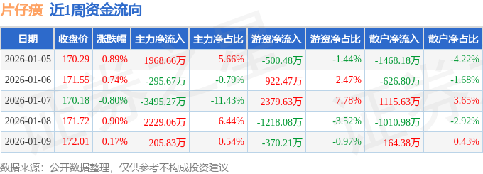 资金流向数据方面,本周片仔癀主力资金合计净流入612.61万元,游资资金合计净流入1213.33万元,散户资金合计净流出1825.94万元。本周资金流向一览见下表: