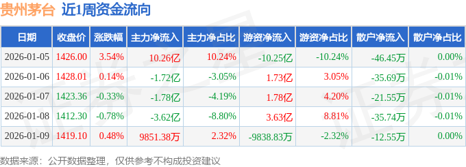 资金流向数据方面,本周贵州茅台主力资金合计净流入4.12亿元,游资资金合计净流出4.11亿元,散户资金合计净流出151.99万元。本周资金流向一览见下表:
