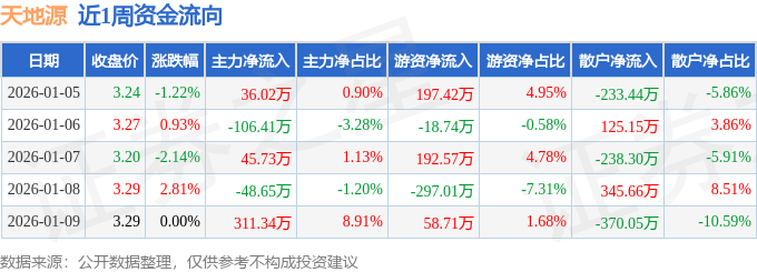 资金流向数据方面,本周天地源主力资金合计净流入238.02万元,游资资金合计净流入132.95万元,散户资金合计净流出370.97万元。本周资金流向一览见下表: