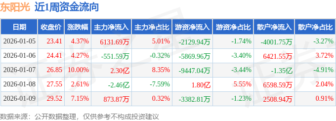 资金流向数据方面,本周东阳光主力资金合计净流入4850.89万元,游资资金合计净流出2867.91万元,散户资金合计净流出1982.97万元。本周资金流向一览见下表: