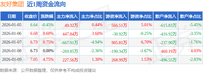 资金流向数据方面,本周友好集团主力资金合计净流出213.03万元,游资资金合计净流入1520.04万元,散户资金合计净流出1307.01万元。本周资金流向一览见下表: