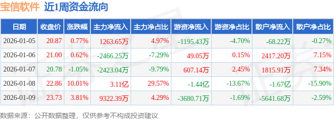 资金流向数据方面,本周宝信软件主力资金合计净流入3.68亿元,游资资金合计净流出1.86亿元,散户资金合计净流出1.82亿元。本周资金流向一览见下表:
