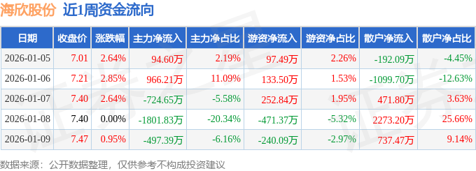 资金流向数据方面,本周海欣股份主力资金合计净流出1963.05万元,游资资金合计净流出227.62万元,散户资金合计净流入2190.68万元。本周资金流向一览见下表: