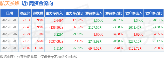 资金流向数据方面,本周航天长峰主力资金合计净流出1.06亿元,游资资金合计净流入4995.23万元,散户资金合计净流入5653.5万元。本周资金流向一览见下表: