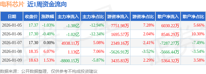 资金流向数据方面,本周电科芯片主力资金合计净流出1.66亿元,游资资金合计净流入9605.63万元,散户资金合计净流入6987.13万元。本周资金流向一览见下表: