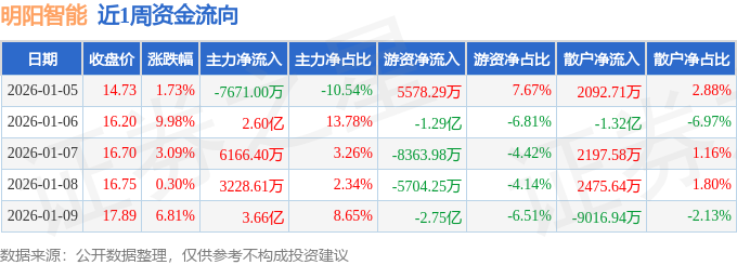 资金流向数据方面,本周明阳智能主力资金合计净流入6.43亿元,游资资金合计净流出4.89亿元,散户资金合计净流出1.54亿元。本周资金流向一览见下表: