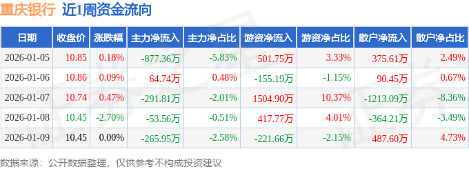 资金流向数据方面,本周重庆银行主力资金合计净流出1423.93万元,游资资金合计净流入2047.58万元,散户资金合计净流出623.64万元。本周资金流向一览见下表: