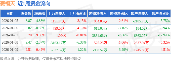 资金流向数据方面,本周赛福天主力资金合计净流入8678.2万元,游资资金合计净流出3908.93万元,散户资金合计净流出4769.27万元。本周资金流向一览见下表: