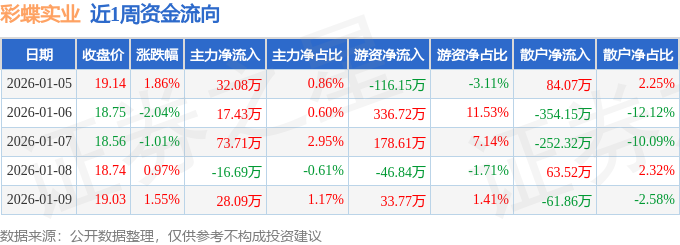 资金流向数据方面,本周彩蝶实业主力资金合计净流入134.62万元,游资资金合计净流入386.11万元,散户资金合计净流出520.73万元。本周资金流向一览见下表: