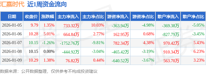 资金流向数据方面,本周汇嘉时代主力资金合计净流出722.7万元,游资资金合计净流出524.6万元,散户资金合计净流入1247.29万元。本周资金流向一览见下表: