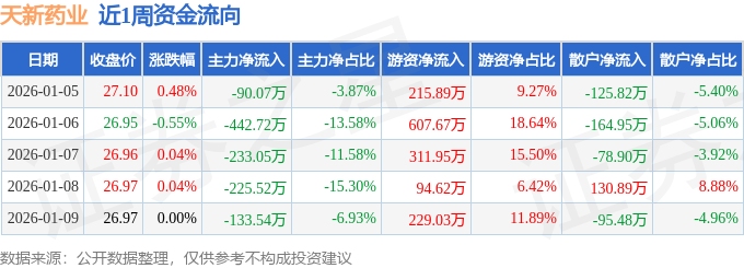 资金流向数据方面,本周天新药业主力资金合计净流出1124.9万元,游资资金合计净流入1459.17万元,散户资金合计净流出334.27万元。本周资金流向一览见下表:
