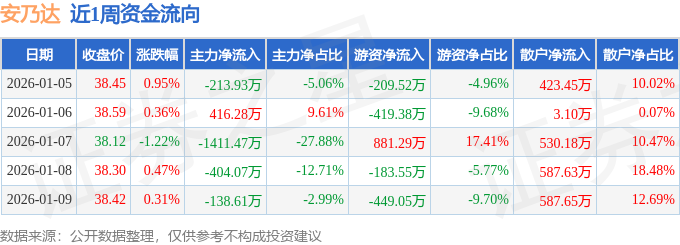 资金流向数据方面,本周安乃达主力资金合计净流出1751.8万元,游资资金合计净流出380.21万元,散户资金合计净流入2132.0万元。本周资金流向一览见下表: