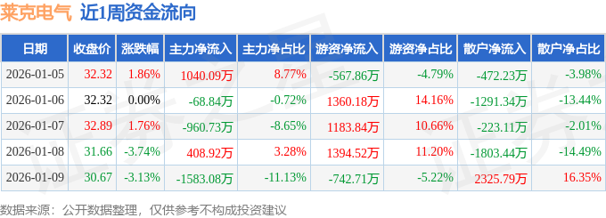 资金流向数据方面,本周莱克电气主力资金合计净流出1163.64万元,游资资金合计净流入2627.97万元,散户资金合计净流出1464.33万元。本周资金流向一览见下表: