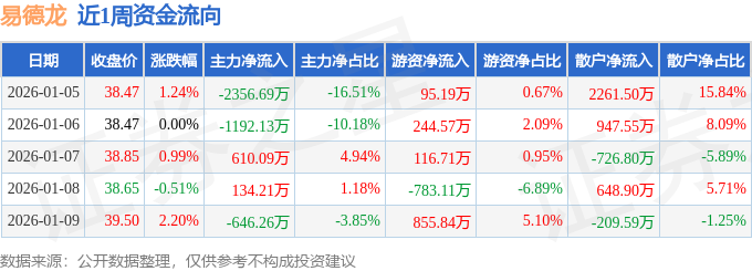 资金流向数据方面,本周易德龙主力资金合计净流出3450.77万元,游资资金合计净流入529.2万元,散户资金合计净流入2921.56万元。本周资金流向一览见下表: