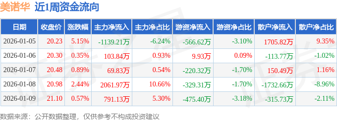 资金流向数据方面,本周美诺华主力资金合计净流入1887.57万元,游资资金合计净流出1581.71万元,散户资金合计净流出305.85万元。本周资金流向一览见下表: