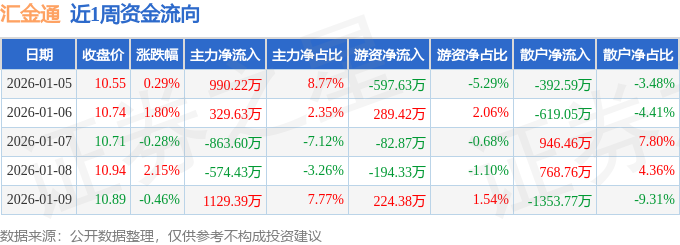 资金流向数据方面,本周汇金通主力资金合计净流入1011.22万元,游资资金合计净流出361.02万元,散户资金合计净流出650.19万元。本周资金流向一览见下表: