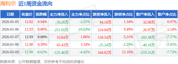 资金流向数据方面,本周海利尔主力资金合计净流出334.47万元,游资资金合计净流入738.34万元,散户资金合计净流出403.87万元。本周资金流向一览见下表: