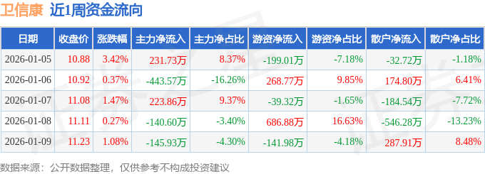 资金流向数据方面,本周卫信康主力资金合计净流出274.51万元,游资资金合计净流入575.33万元,散户资金合计净流出300.83万元。本周资金流向一览见下表:
