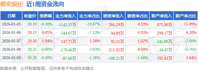 资金流向数据方面,本周德宏股份主力资金合计净流出1604.52万元,游资资金合计净流入511.01万元,散户资金合计净流入1093.51万元。本周资金流向一览见下表: