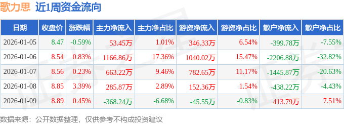 资金流向数据方面,本周歌力思主力资金合计净流入1801.16万元,游资资金合计净流入2275.8万元,散户资金合计净流出4076.96万元。本周资金流向一览见下表: