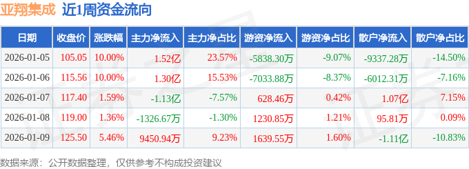 资金流向数据方面,本周亚翔集成主力资金合计净流入2.5亿元,游资资金合计净流出9373.32万元,散户资金合计净流出1.56亿元。本周资金流向一览见下表: