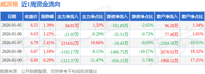 资金流向数据方面,本周威派格主力资金合计净流出217.08万元,游资资金合计净流出2399.94万元,散户资金合计净流入2617.02万元。本周资金流向一览见下表: