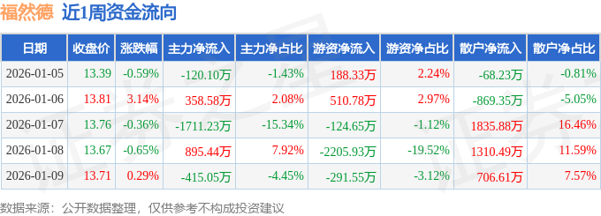 资金流向数据方面,本周福然德主力资金合计净流出992.36万元,游资资金合计净流出1923.03万元,散户资金合计净流入2915.39万元。本周资金流向一览见下表: