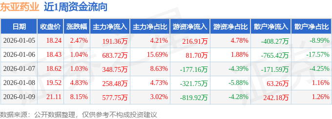 资金流向数据方面,本周东亚药业主力资金合计净流入2060.06万元,游资资金合计净流出1020.22万元,散户资金合计净流出1039.84万元。本周资金流向一览见下表: