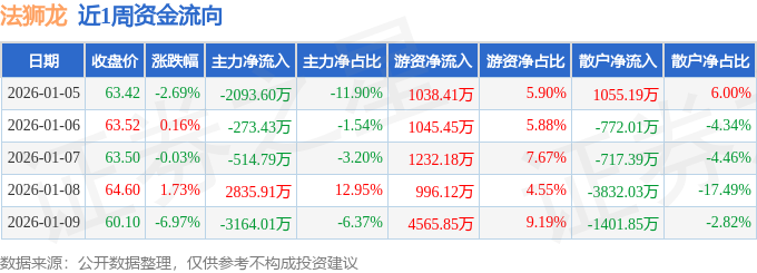 资金流向数据方面,本周法狮龙主力资金合计净流出3209.92万元,游资资金合计净流入8878.01万元,散户资金合计净流出5668.08万元。本周资金流向一览见下表: