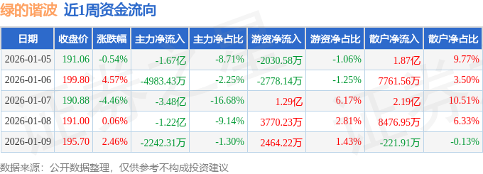 资金流向数据方面,本周绿的谐波主力资金合计净流出7.1亿元,游资资金合计净流入1.43亿元,散户资金合计净流入5.67亿元。本周资金流向一览见下表: