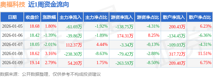 资金流向数据方面,本周奥福科技主力资金合计净流出173.28万元,游资资金合计净流出310.79万元,散户资金合计净流入484.07万元。本周资金流向一览见下表: