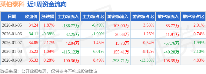 资金流向数据方面,本周莱伯泰科主力资金合计净流出101.75万元,游资资金合计净流出4.23万元,散户资金合计净流入105.98万元。本周资金流向一览见下表: