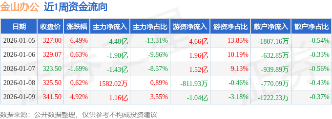 资金流向数据方面,本周金山办公主力资金合计净流出6.48亿元,游资资金合计净流入7.02亿元,散户资金合计净流出5372.22万元。本周资金流向一览见下表: