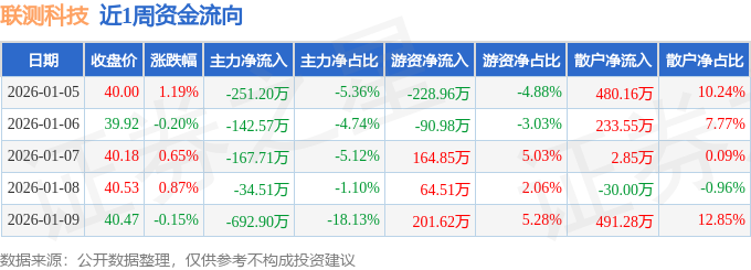 资金流向数据方面,本周联测科技主力资金合计净流出1288.89万元,游资资金合计净流入111.05万元,散户资金合计净流入1177.85万元。本周资金流向一览见下表: