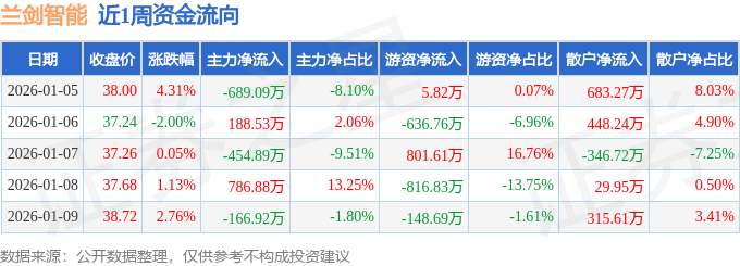 资金流向数据方面,本周兰剑智能主力资金合计净流出335.49万元,游资资金合计净流出794.86万元,散户资金合计净流入1130.34万元。本周资金流向一览见下表: